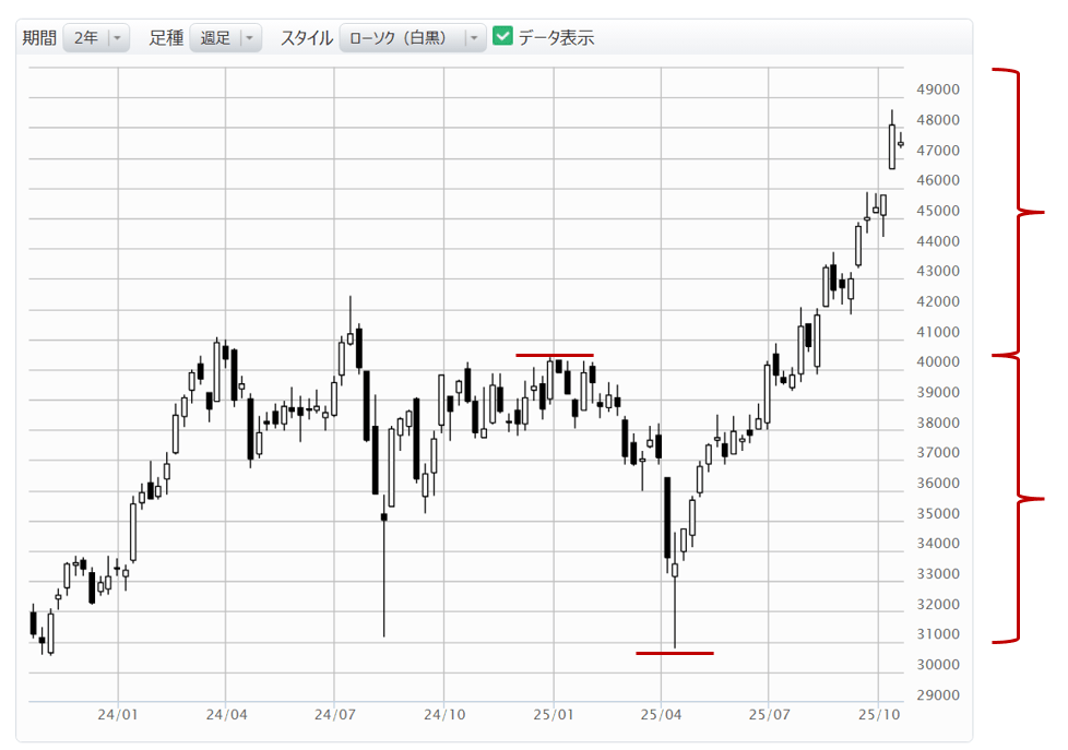 取引時間ベースでいくと、2024年12月27日高値から4月7日安値までの大きな下落幅に対する倍返しの上げで5万円付近です。バブル崩壊後の長い低迷期間を含めた動きの中からでも5万円台前半の試算はできます。それを達成するためには、どこかの段階でスピード調整(助走をつけるための引き)が必要なのです。