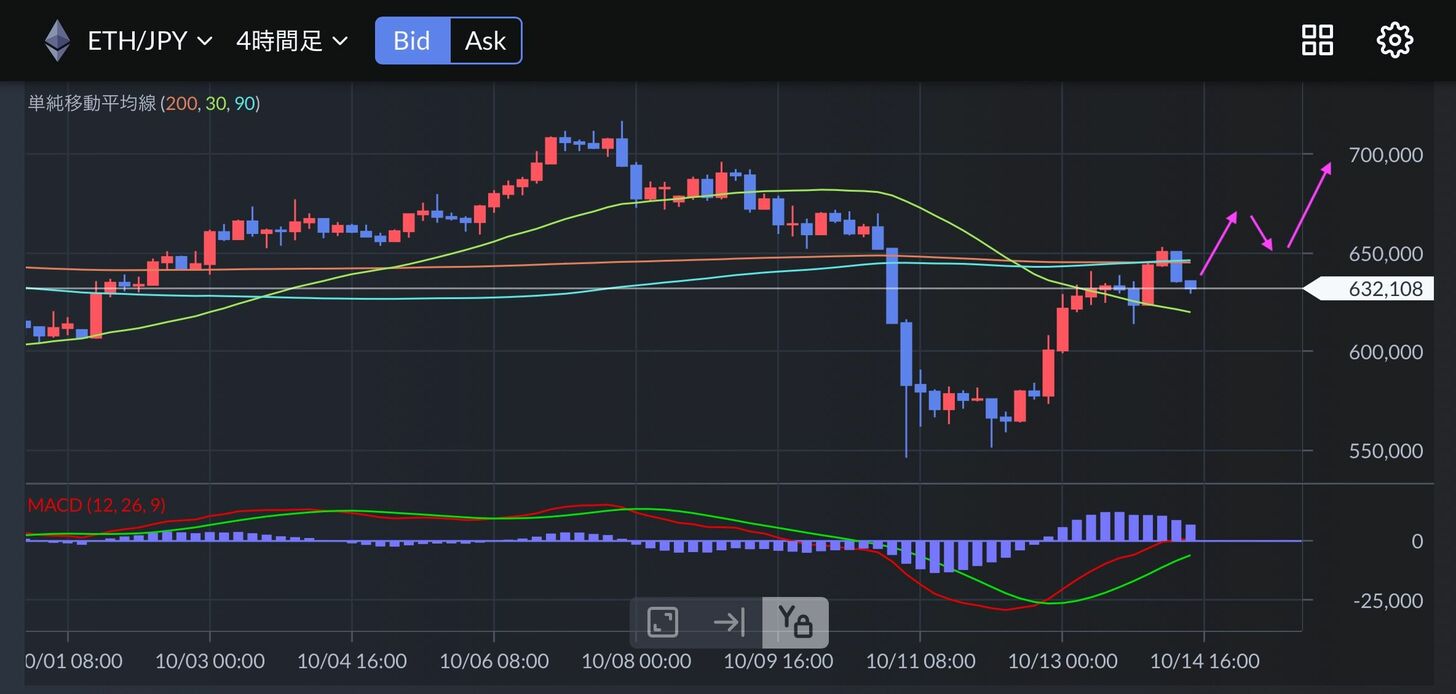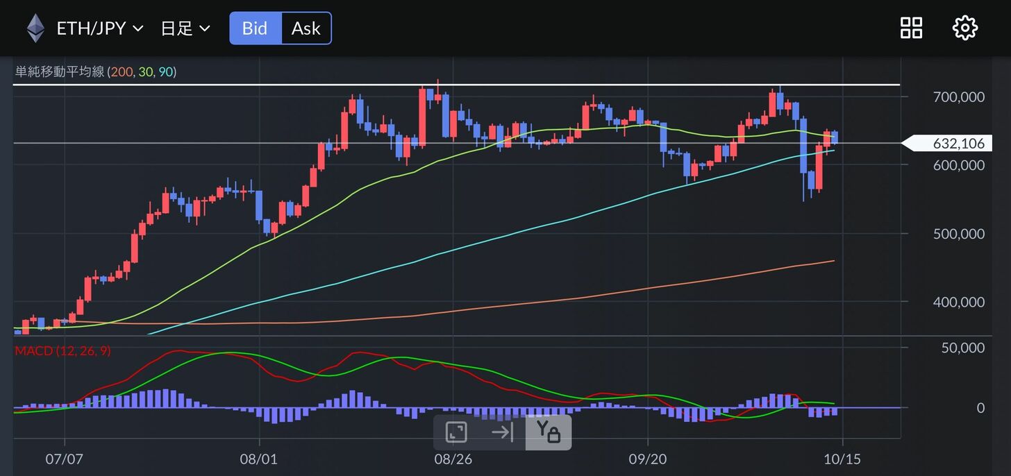 ETH(イーサリアム)、MACDの位置からみると方向感のない展開に