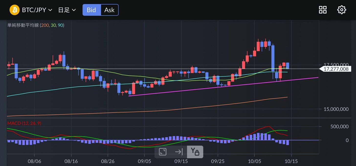 BTC/JPYの日足チャートを見ると、史上最高値からの大陰線は象徴的です。第4四半期に向けた年末ラリーの期待でポジションが買いに偏っていたことを示しています。日本の連休明けとなる10月14日現在、東京市場では売りが優勢ではじまりましたが、個人的には、これらの売りは一時的なものであり、欧州時間以降には買い戻しが入る展開を想定しています。