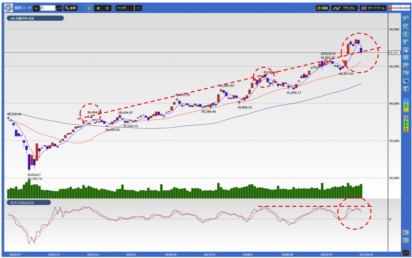 上記のような状況から、今後もこのトレンドラインを上回ったまま維持すると、高市トレードが継続中と考えられ、高値更新に対する期待が続くでしょう。一方で、このトレンドラインを下回って戻せなくなるようだと、高市新総裁が誕生する前の水準に戻ってしまうことが視野に入るとともに、25日移動平均線を割り込むことが考えられるため、高値掴みを避けるとともに損失の発生や拡大に注意が必要です。