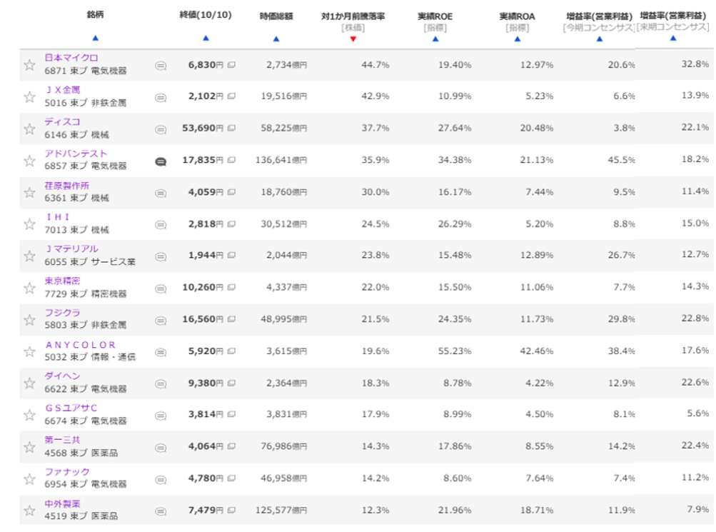 マネックス証券のウェブサイトで提供している「銘柄スカウター」の10年スクリーニングを用いて、過去1ヶ月間の騰落率上位銘柄を選びました。