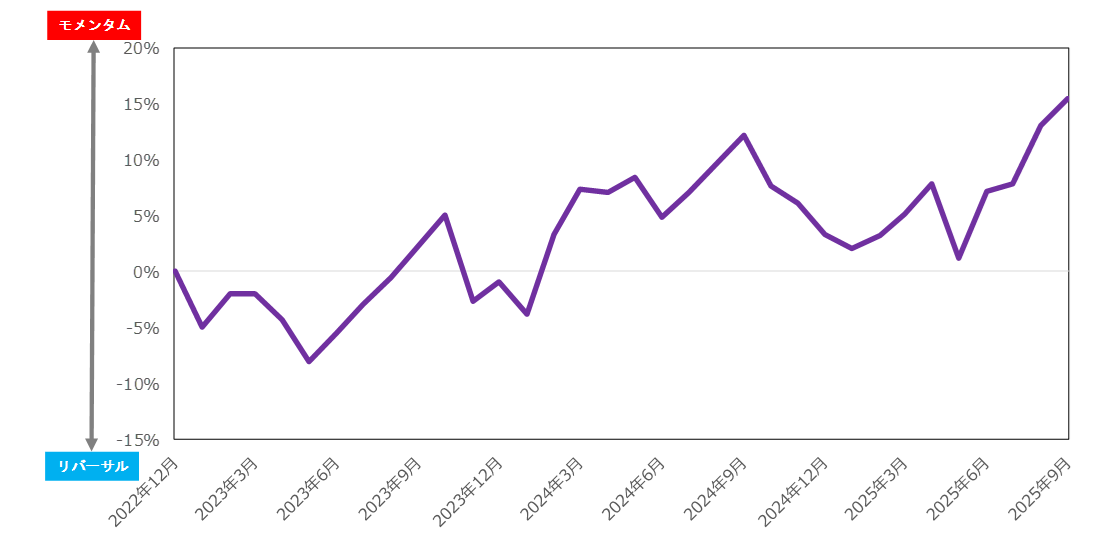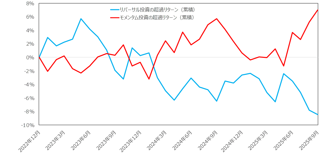 一方、同様な方法で、前月に株価の下落が大きかった(相対的に上昇が小さかった)銘柄のその後の株式パフォーマンスを示すリバーサル投資のパフォーマンス(青線グラフ)を見てみましょう。2025年9月はマイナスとなっています。赤線グラフのモメンタム投資の方が効果的なことが分かります。