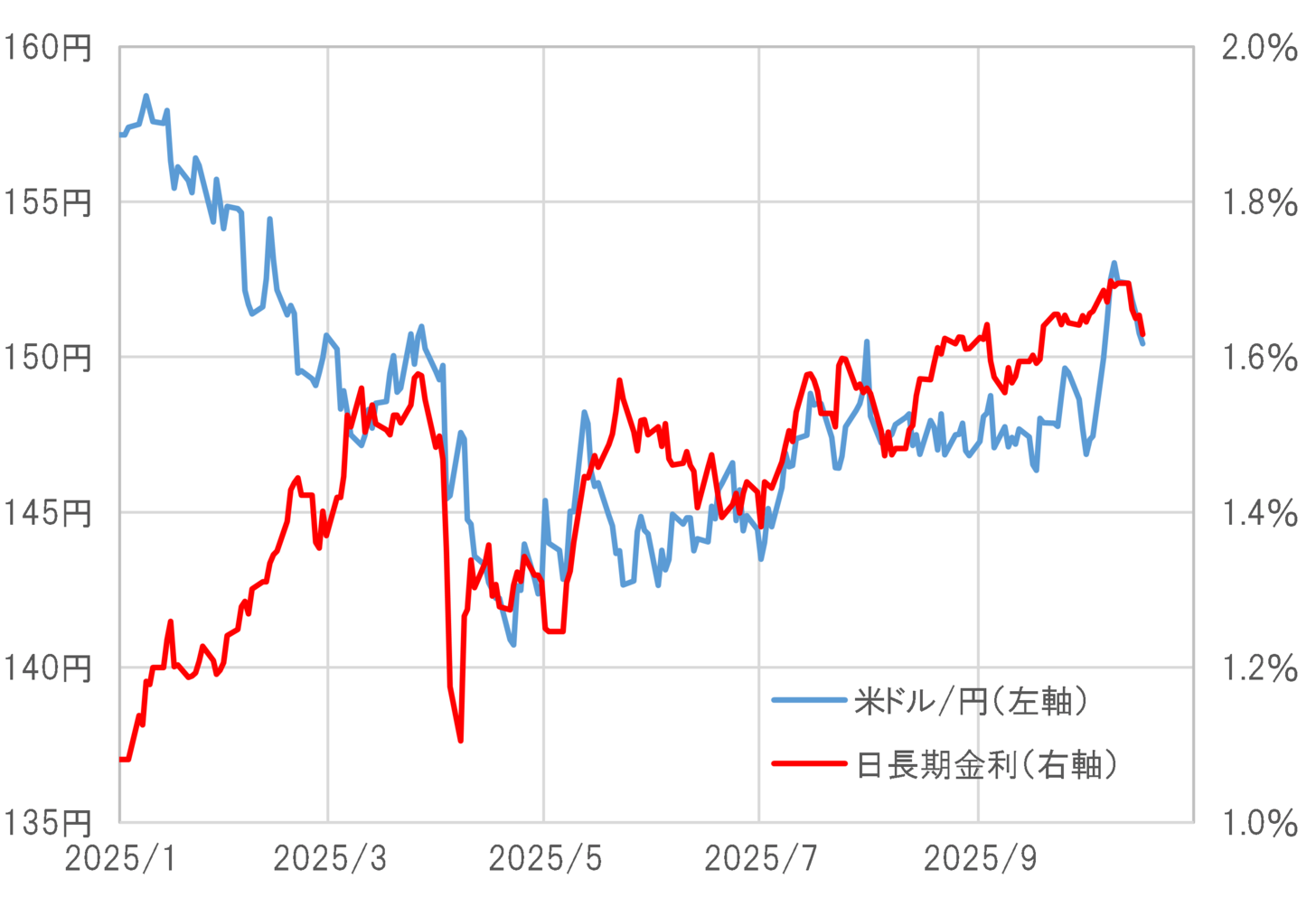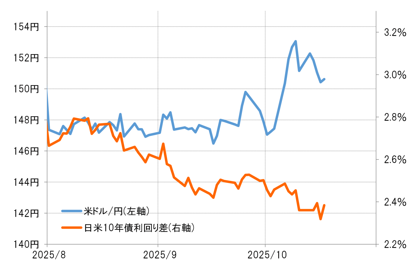 高市新総裁誕生をきっかけに52週MAを上回った今回の米ドル/円の上昇は、日米金利差(米ドル優位・円劣位)からは大きくかい離したものだった(図表2参照)。そして、そのように日米金利差からかい離した米ドル/円の一段高をかろうじて説明できそうだったのは、この数ヶ月続いてきた日本の長期金利上昇への連動、別の言い方をすると「日本の長期金利上昇=円安」という金利と円の「負の相関」関係だった。
