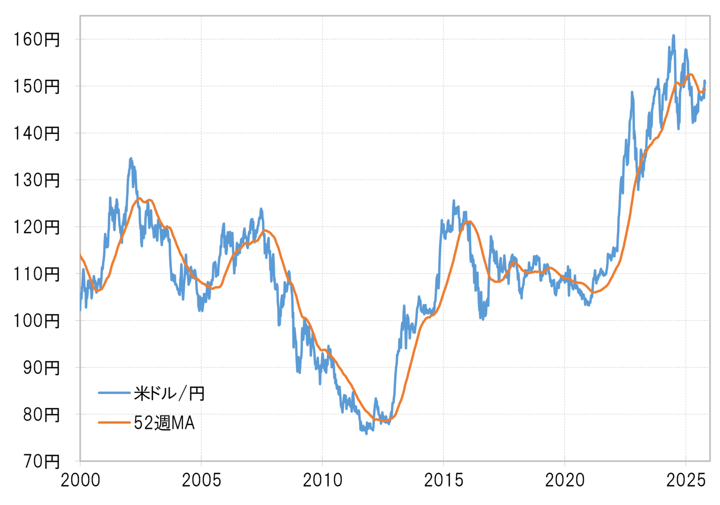 高市自民党新総裁誕生をきっかけに150円を超えて一段高となったことで、10月17日現在で149.2円の52週MA(移動平均線)を米ドル/円は2週連続で上回った(図表1参照)。ただし、この米ドル/円上昇が、2024年7月の161円から展開している下落トレンドと逆行する、あくまで一時的な動きなら、経験的に「大きく」「長く」は続かない可能性が高い。