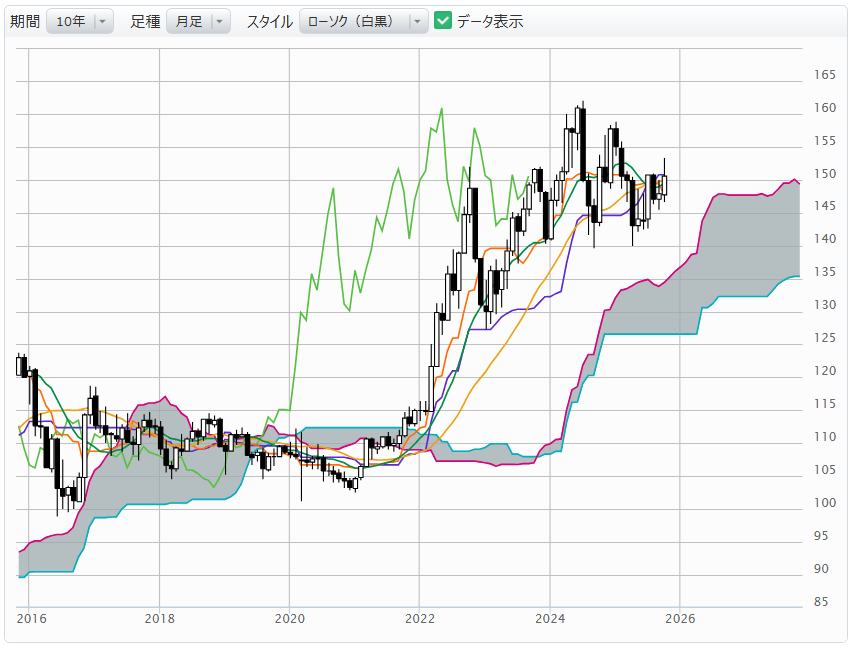 おそらく、10月以降1ドル=153円台まで入った動きが「米ドル高・円安」の初動の動きになった可能性が高いでしょう。2024年7月高値を起点に2025年1月高値を通る抵抗線まで上昇する結果となりましたが、その後の短期的な揺り戻し(米ドル安・円高)も一目均衡表の基準線(149.37円)まで押しを形成し、すでに終了した可能性が高いです(図表2)。
