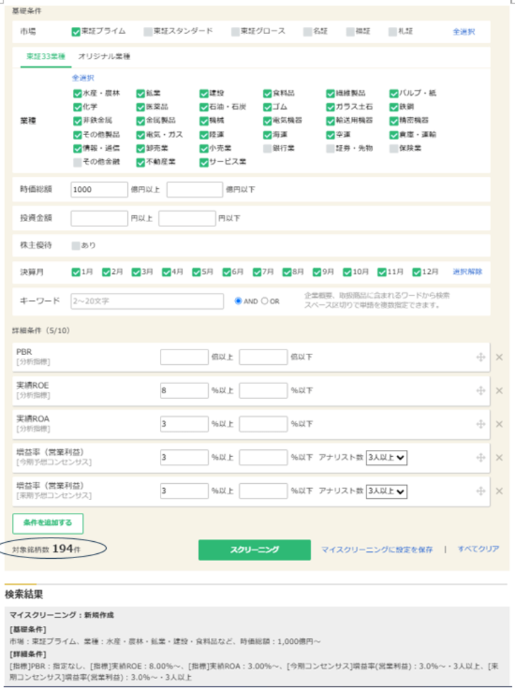 そこで、実際に筆者がマネックス証券のウェブサイトで提供している「銘柄スカウター」の10年スクリーニングを用いて参考銘柄を抽出しました。