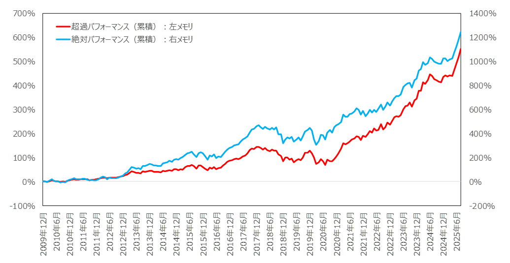注4:母数のうち毎月末時点でPBROEモデルから求めた魅力度が高い方から20%に該当する銘柄に等金額投資した場合の翌月のリターンを算出して、絶対パフォーマンスは2010年1月以降を累積している。超過パフォーマンスは対象となる月の母数全体に等金額投資した場合のリターンを引いた超過分を求めて2010年12以降累積している
