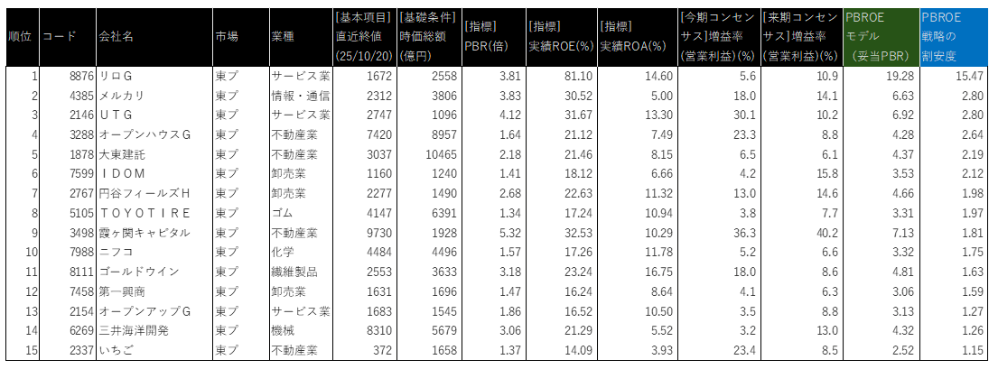 上位銘柄がPBROE戦略から注目される銘柄です。