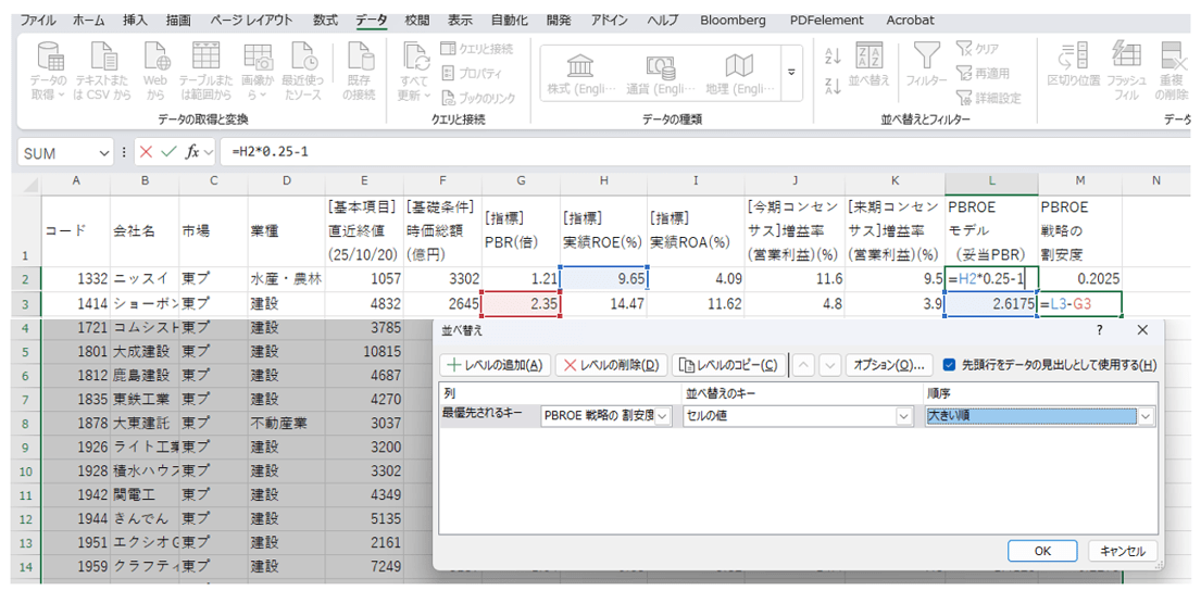 最後にM列の「PBROE戦略の割安度」で降順(大きい順)にソート(並べ替え)します。