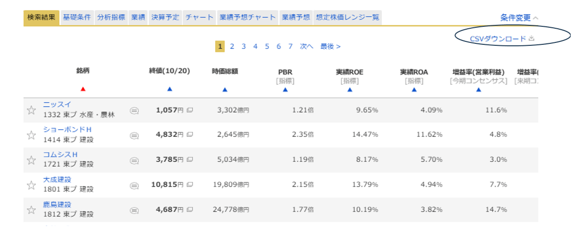 スクリーニングを実行すると、左下に対象銘柄数が表示されます。ここで注意点があります。後に、Excel処理のために行う「csvダウンロード」は200銘柄までの制限があります。そこで対象銘柄数が200銘柄以内であることを確認します。仮に、200銘柄を超えていたら、1000億円の時価総額の最低基準を少し増やして対象銘柄を200銘柄までに抑えるようにしてください。