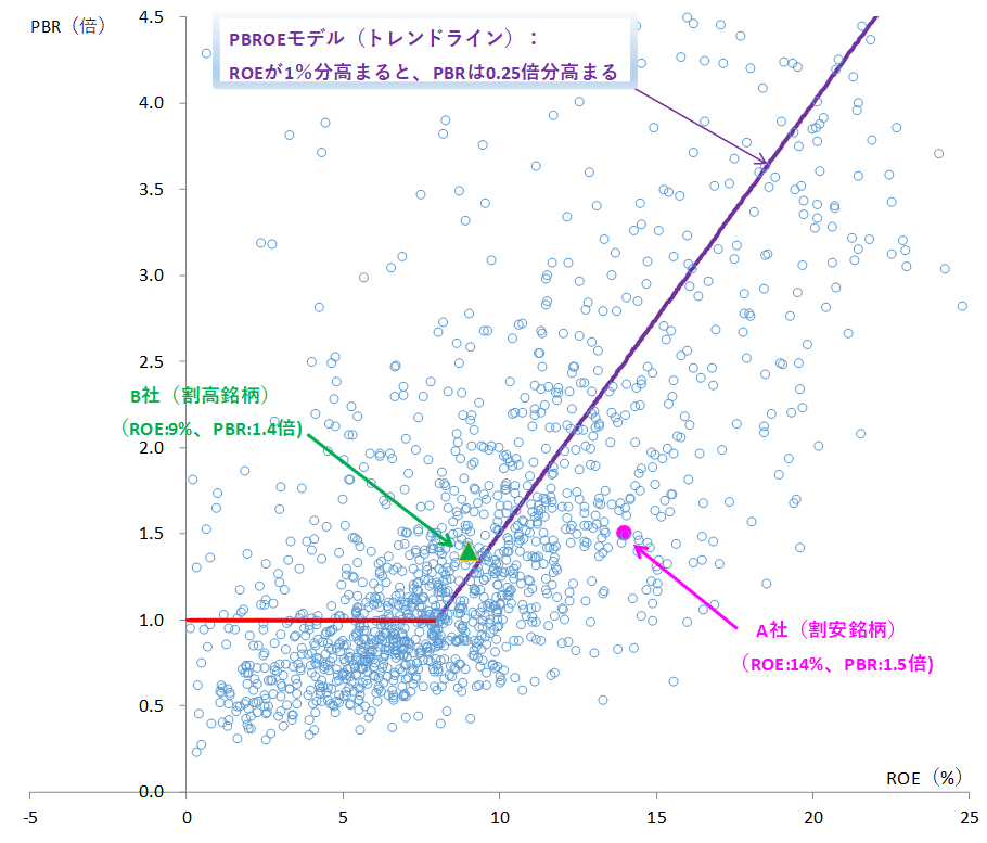 A社(ピンクの〇点)は、横軸のROEが14%で縦軸のPBRが1.5倍の企業です。このA社は、紫色の線で示されたPBROEモデル(トレンドライン)を下回っているため、割安銘柄となります。ROEが14%と高いため、PBROEモデル上ではPBRが2.5倍程度まで許容される水準です。A社のPBRは1.5倍にとどまっているため、将来的にはPBRが2.5倍付近まで上昇し、株価の上昇余地があると考えられるのです。