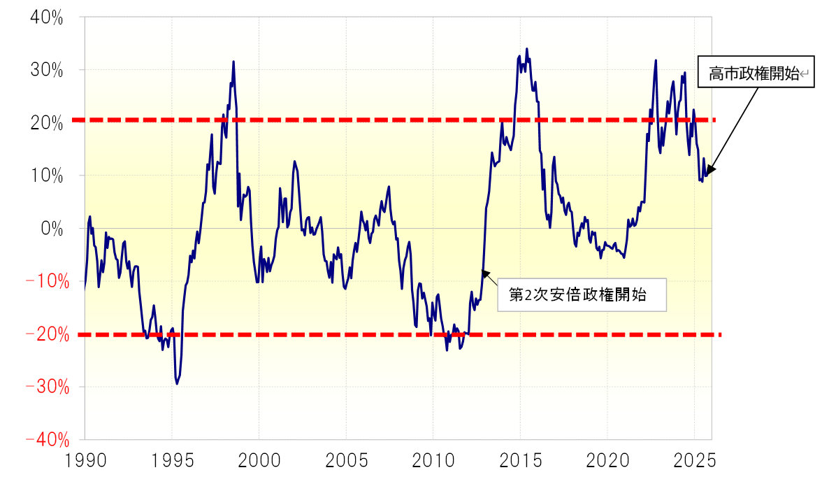このように見ても、2012年12月のアベノミクスのスタート時点と、今回の高市政権スタート時点では、特に米ドル/円の置かれている状況はほぼ真逆となっているのではないか。