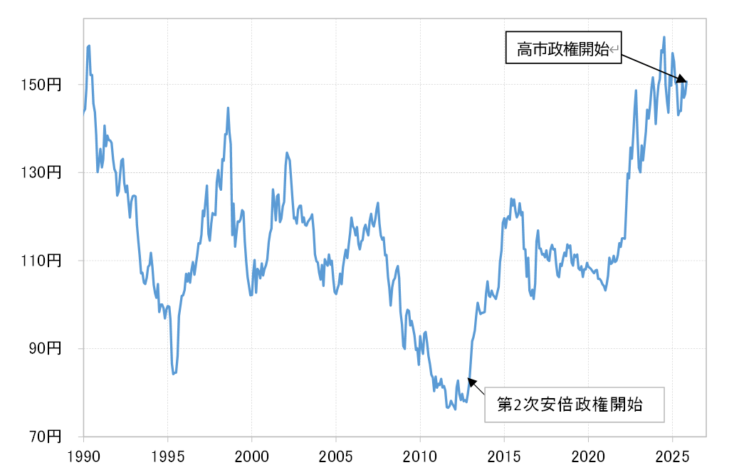 これに対して、今回、高市政権がスタートする足下の米ドル/円は150円近辺での推移となっている。1990年以降の米ドル/円の最高値は、2024年に記録した161円なので、足下は最高値に近い水準での推移となっている。このように見ると、米ドル/円の状況は、2012年12月のアベノミクス開始当時に比べて、ほぼ真逆といえる中で高市新政権は開始することになる。