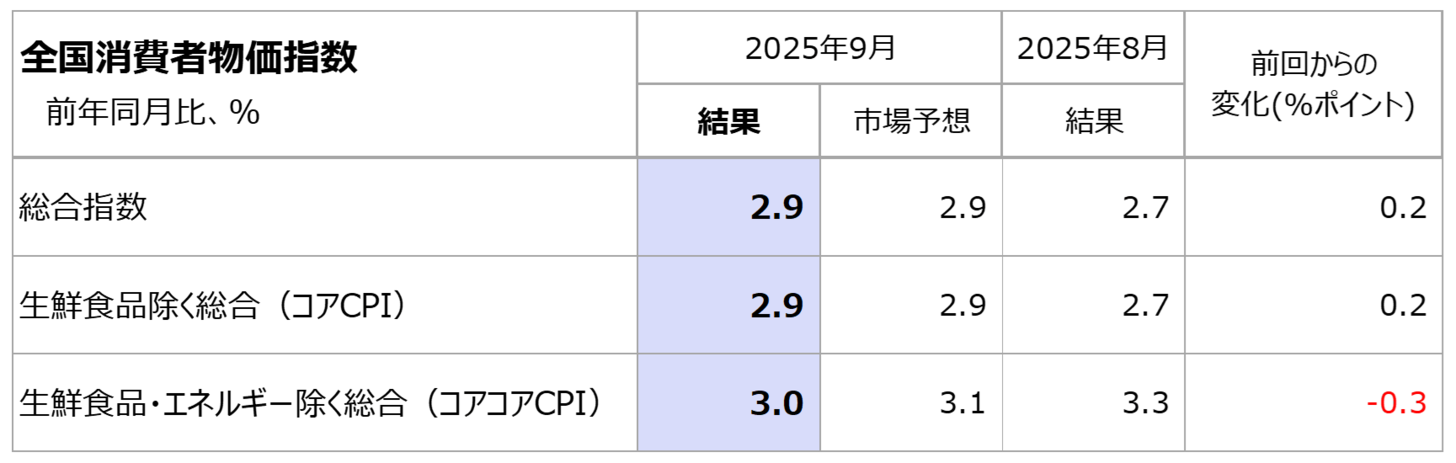 2025年9月の全国消費者物価指数(CPI)は、ヘッドラインである総合指数が市場予想と一致する前年同月比2.9%上昇となりました。前回8月から0.2ポイント伸びが加速しています(図表1)。伸びの加速は2025年1月以来となり、ヘッドライン指数のインフレ率は再び3%に近づく結果となっています。