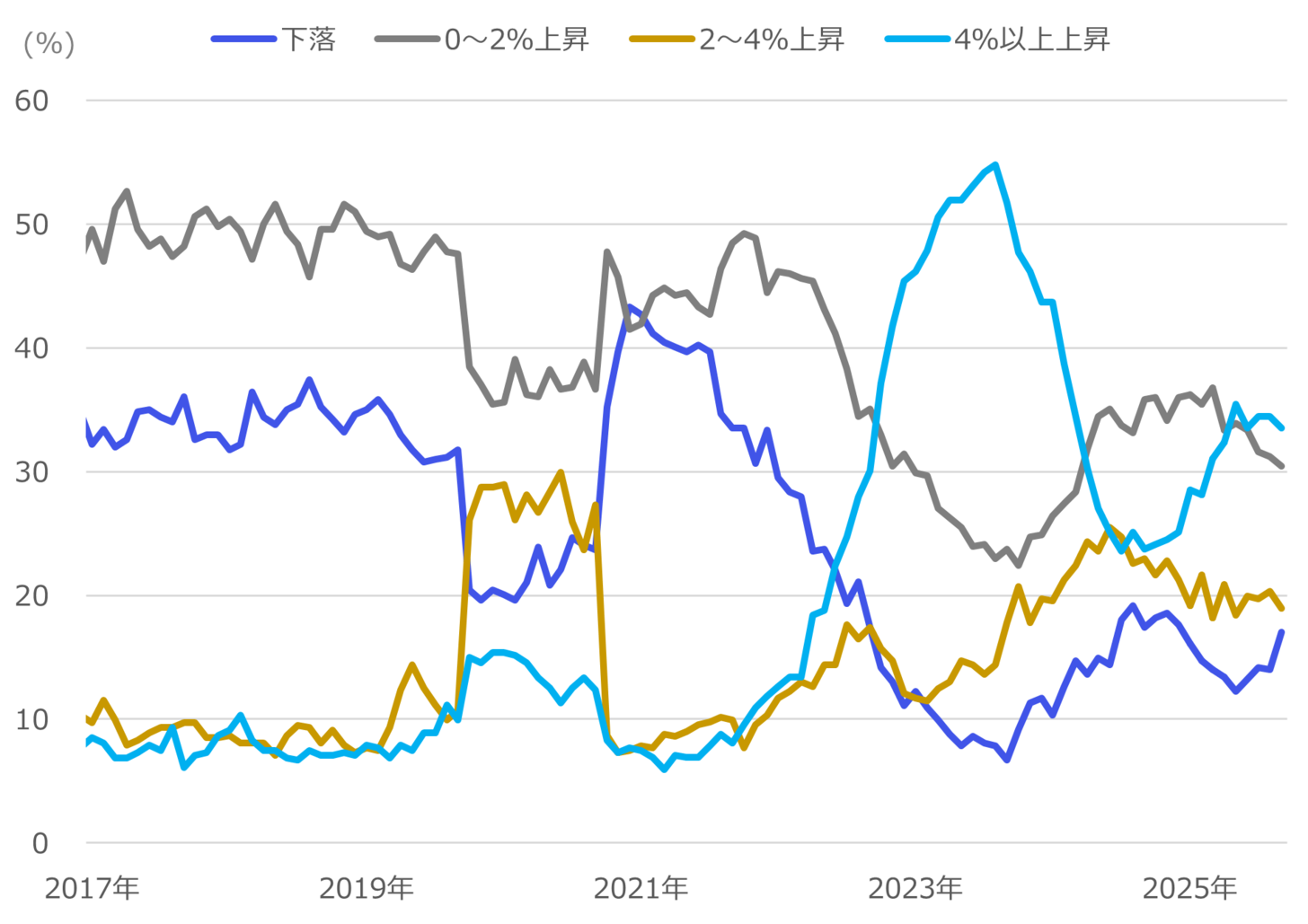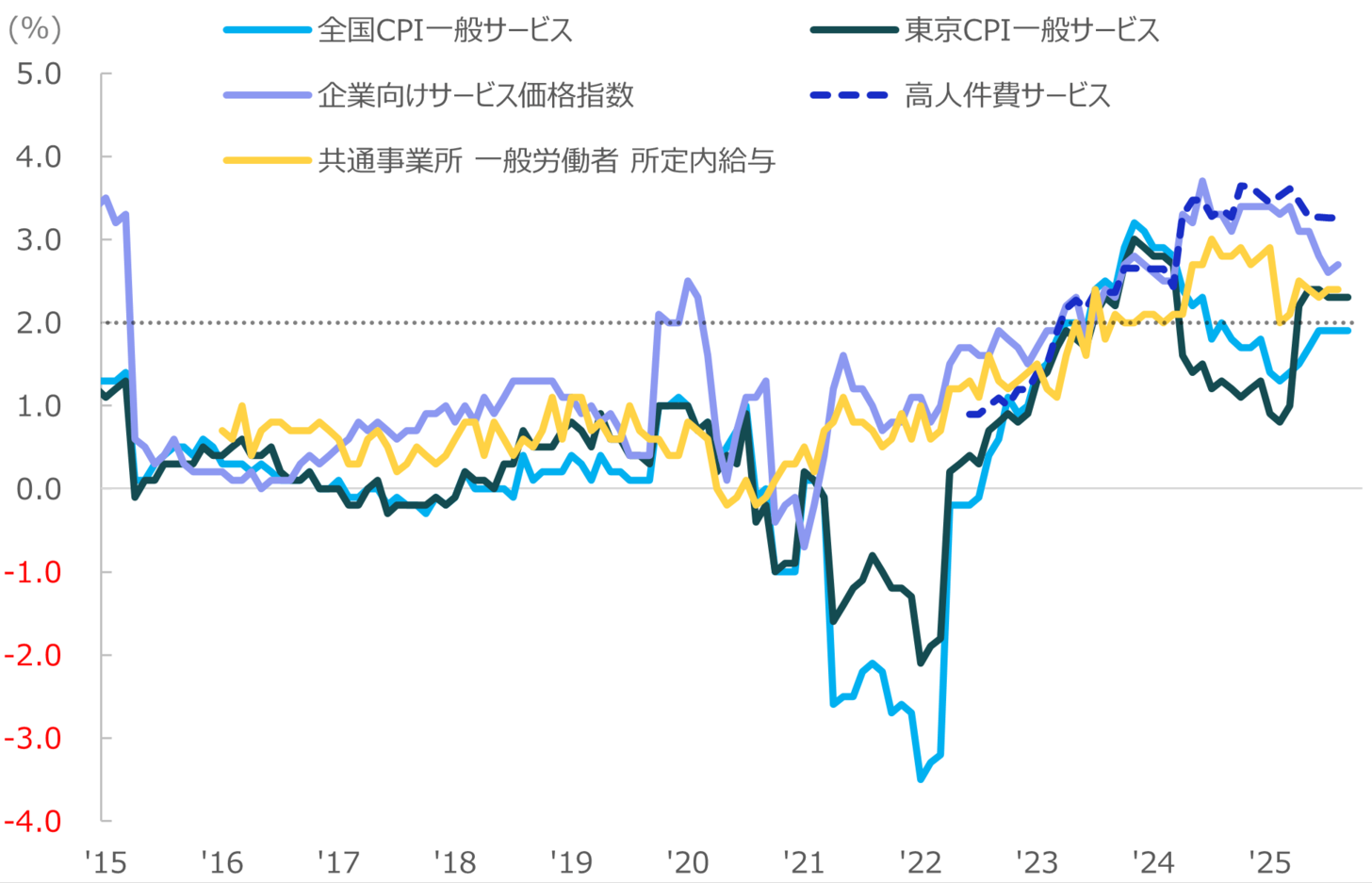 より賃金への波及効果が期待される一般サービス(一般の企業等による外食や家事関連、教育、医療サービス等で構成される指標)は、今回1.9%上昇と、前回8月から横ばいで、日銀がターゲットとする2%に近い上昇が続いています(図表5水色)。サービスや賃金全般ではある程度底堅い推移がうかがえるものの、利上げが意識される昨今において盤石といえるかは懐疑的です。