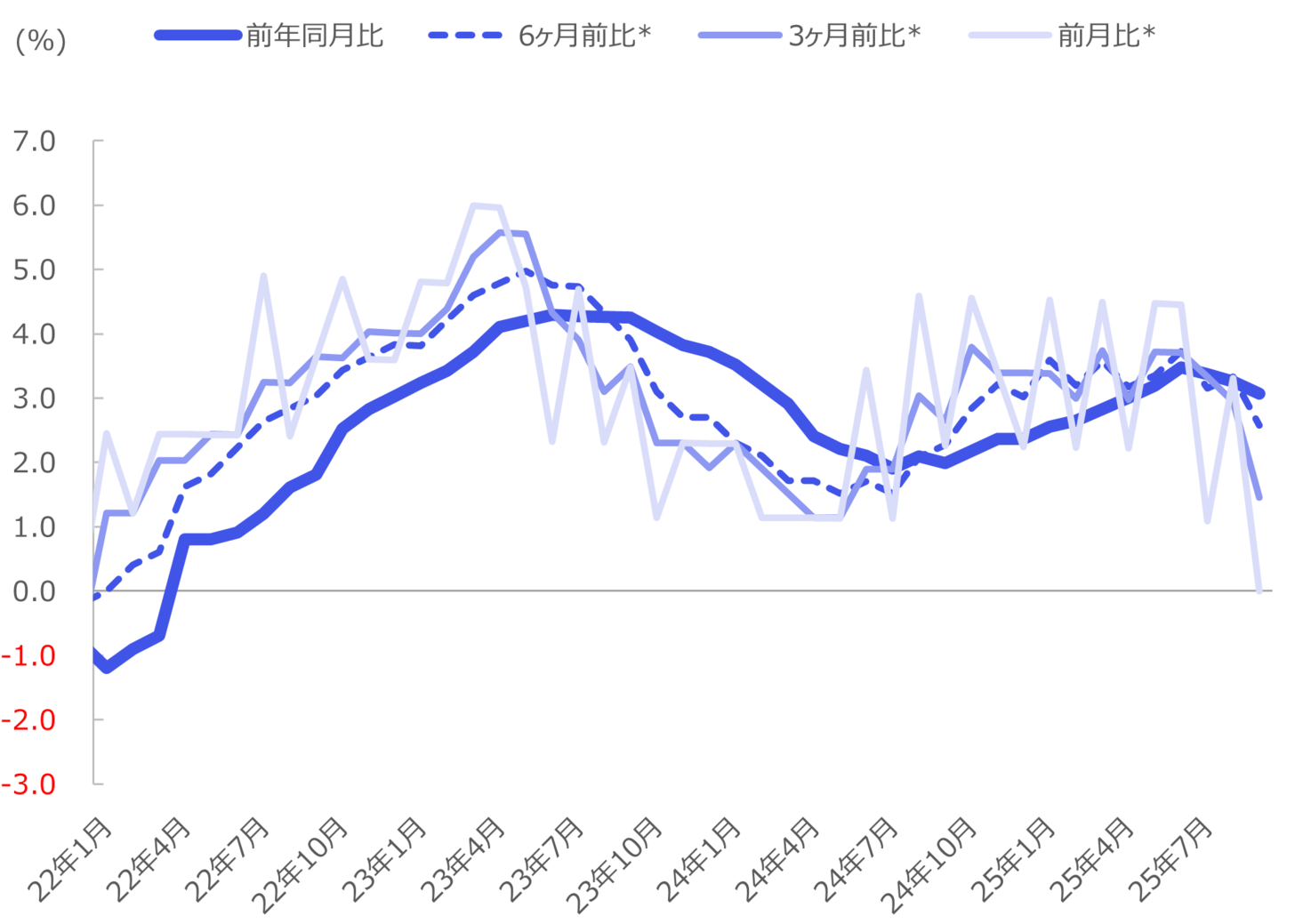 また変動性の高い生鮮食品・エネルギーを除いた総合指数(コアコアCPI)は同3.0%と前回8月から0.3ポイント伸びが縮小しました。季節調整をした前月比では0.0%で横ばいと、コアコア指標は伸びの減速がうかがえます。