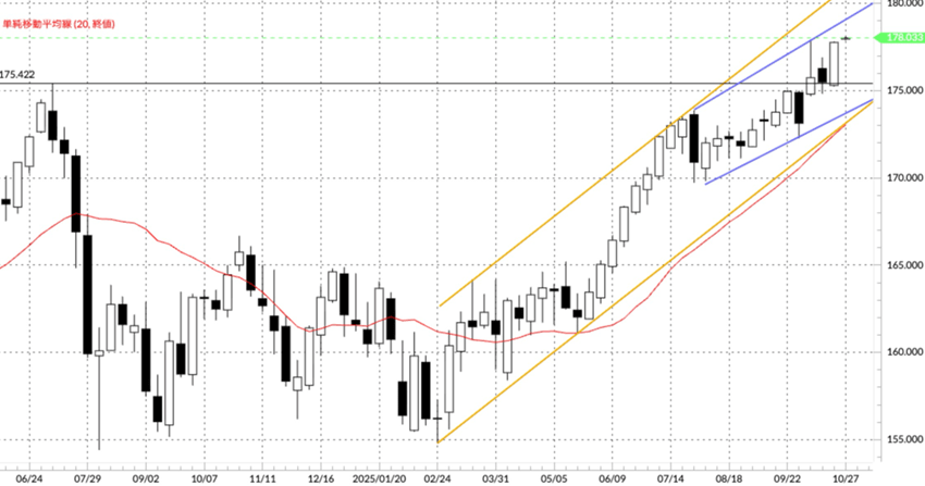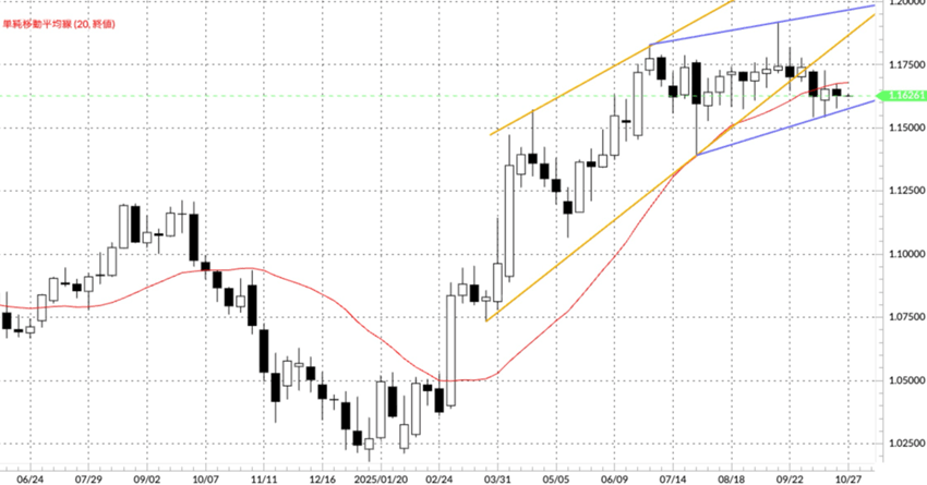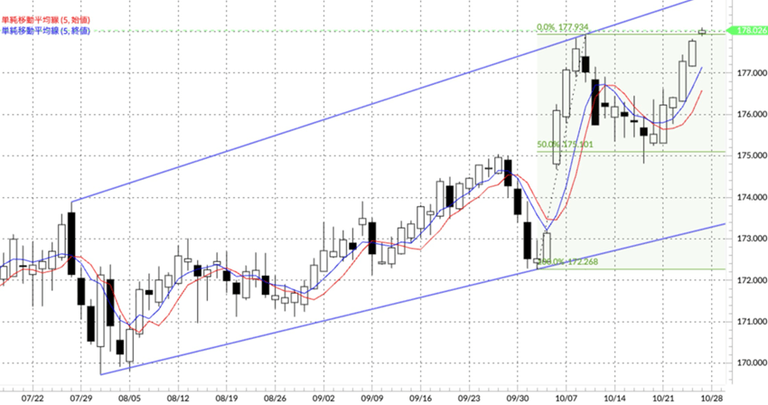 週足チャート(図表1)では、引き続き黄色いライン(長期)で示されるほぼ上昇チャンネル(ウェッジ)の中での動きとテクニカルには目立った変化は出ていません。ただ今週(10月27日週)も上側ラインをトライする水準にあるものの、日米財務相会談、首脳会談から始まり、その後には金融政策イベントが続きますので、短期的には上下どちらにも振り得るという一週間になります。