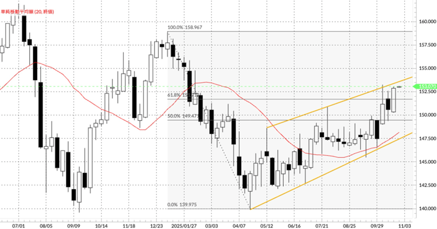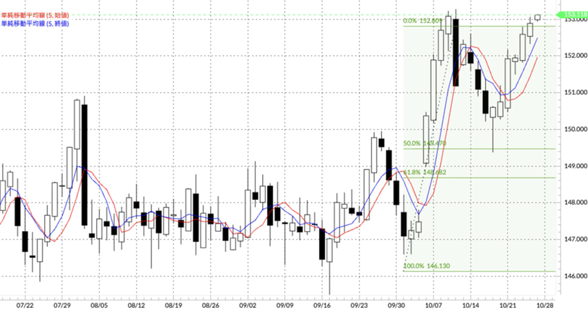 先週(10月20日週)の米ドル/円は、10月20日に自民と維新が連立に合意、10月21日に行われた首班指名で高市首相が誕生、高市トレード再開という流れで円売りが進行することとなりました。週初から週末までほぼ一貫した円安の動きは週明け10月27日も続いていて、米ドル/円は10月高値となる153円台前半へと足を踏み入れてきました。