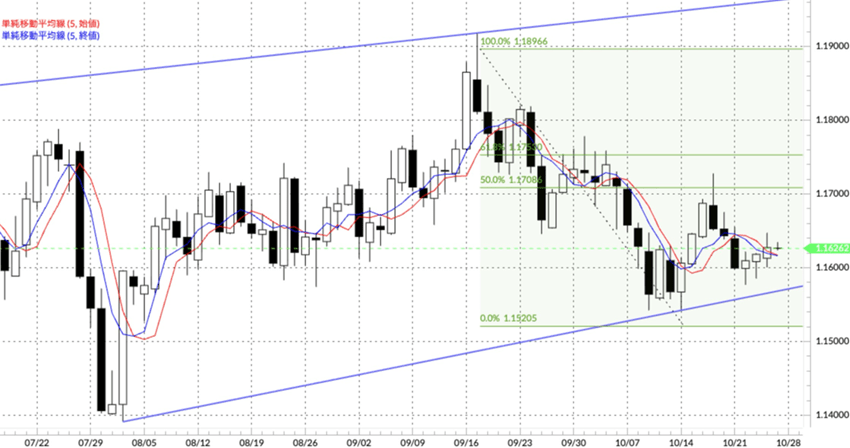 先週(10月20日週)のユーロ/米ドルは、米ドル/円の米ドルの動き同様に、週前半は米ドル買い・ユーロ売りの動きとなっていましたが、10月22日に1.15768ドルで底を打ち、その後週末に向けてはユーロ買い戻しが強まりました。これはユーロ/円が米ドル/円とともに週を通して円安方向に動いた影響が大きかったと言えます。