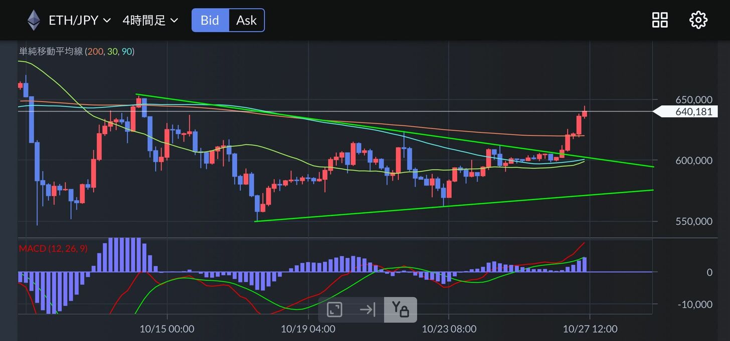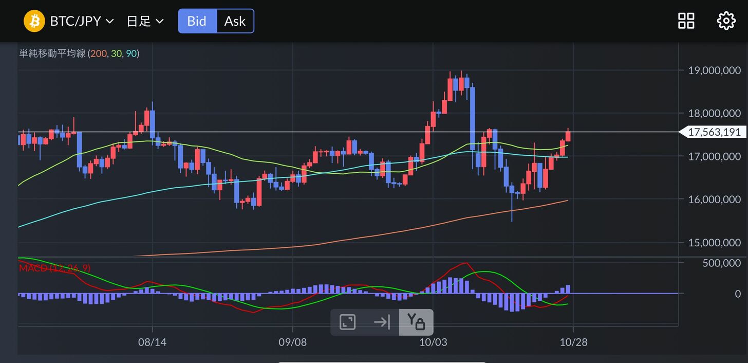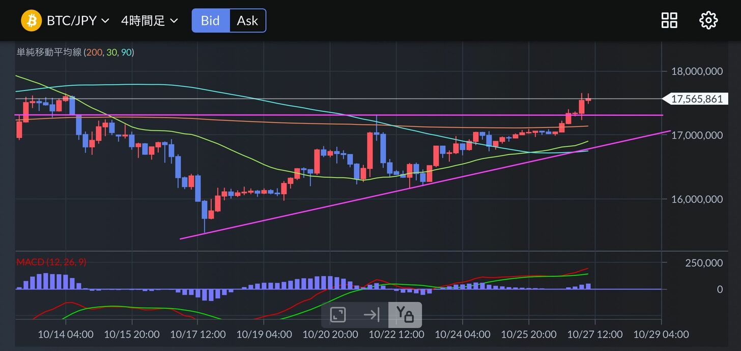 ただし、後者のケースでは2%以上の調整が必要となるため、早朝からの強い上昇トレンドをここまで失速させるかは疑問です。また、10月22日ごろにつけた高値(1,725~1,730万円)がサポートとして機能しており、1.5%ほどの押しで反発する可能性もあります。
