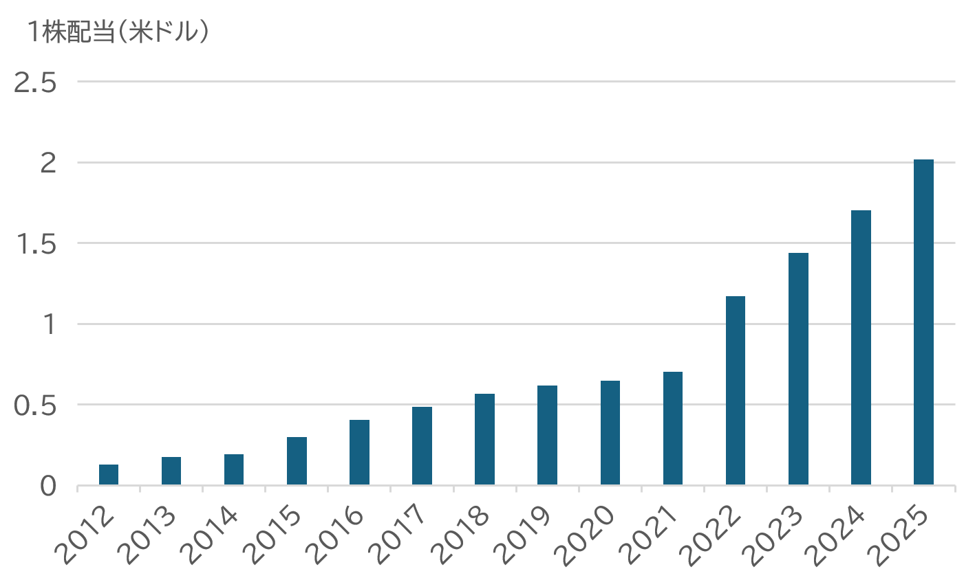 また、同社は株主還元にも積極的で、フリーキャッシュフローの80%以上を還元することとし、2025年1月期からの累計還元額は145億ドルに達しました。この上半期には、29億ドルの自社株買いと7億6000万ドルの配当を通じて株主還元を行いました。配当については、直近では18%の増配を実施し、1株当たり年間配当は2.10ドルに上昇。同社では2030年まで年間10%以上の増配を続ける意向です。