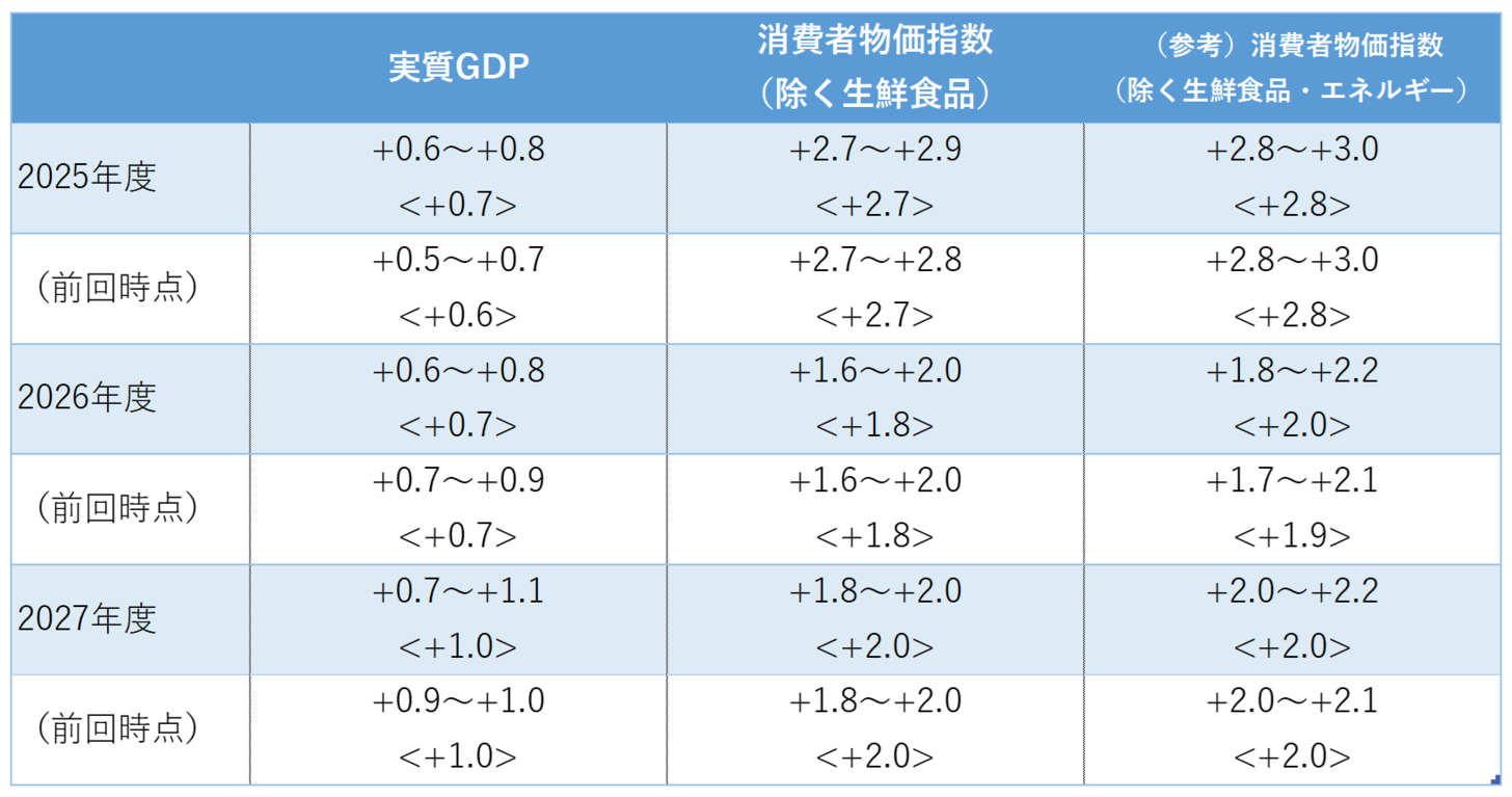 同時に年4回示される「経済・物価情勢の展望」(展望レポート)が公表されました。前回7月時点の見通しから、2025年度の実質GDPが対前年度比0.7%の成長と小幅に上方修正されたほか、インフレ見通しは、消費者物価指数(除く生鮮食品・エネルギー)の2026年度見通しが0.1%ポイント上昇の同2.0%に修正されるも概ね不変となりました(図表参照)。
