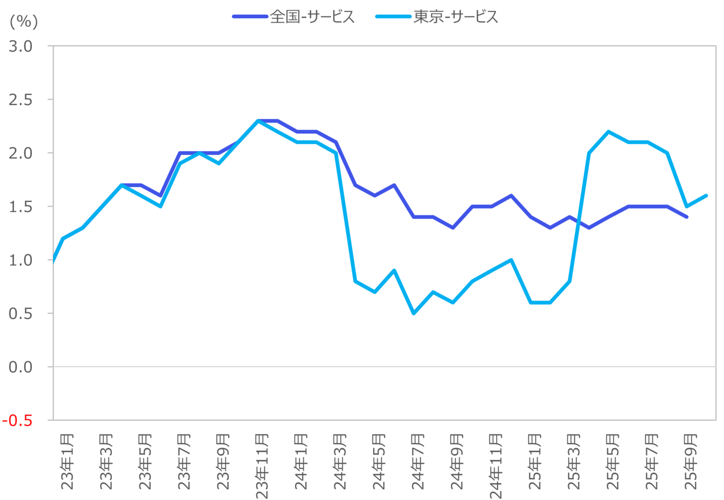 東京都区部のサービスCPIは、宿泊料や習い事などの月謝類、携帯電話通信料などが上昇に寄与し、前年同月比1.6%上昇となりました(図表3)。9月は東京都特有の保育料無償化の影響から伸びの鈍化がみられましたが、10月は伸びが加速しサービスのインフレ基調が継続していることがうかがえます。