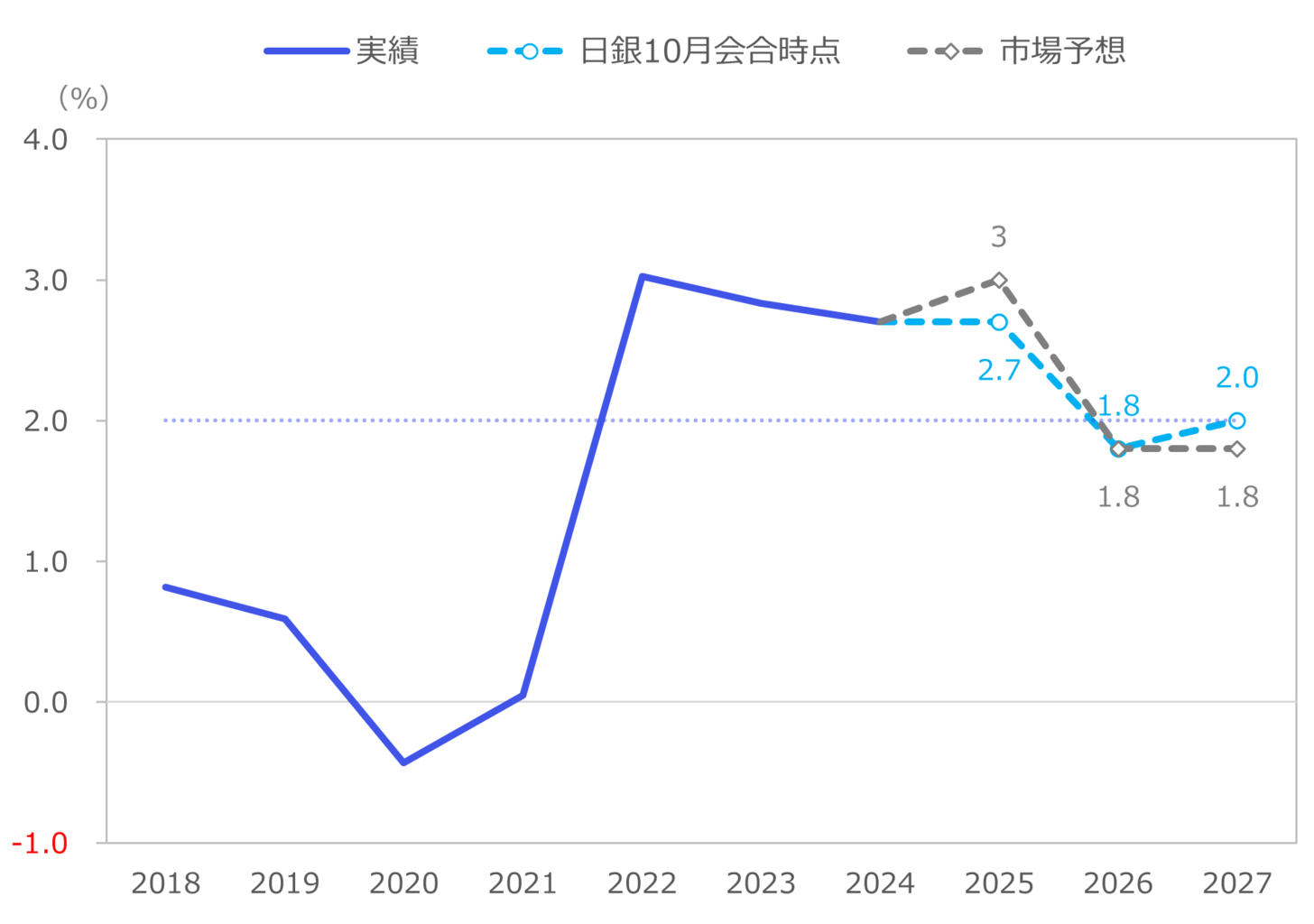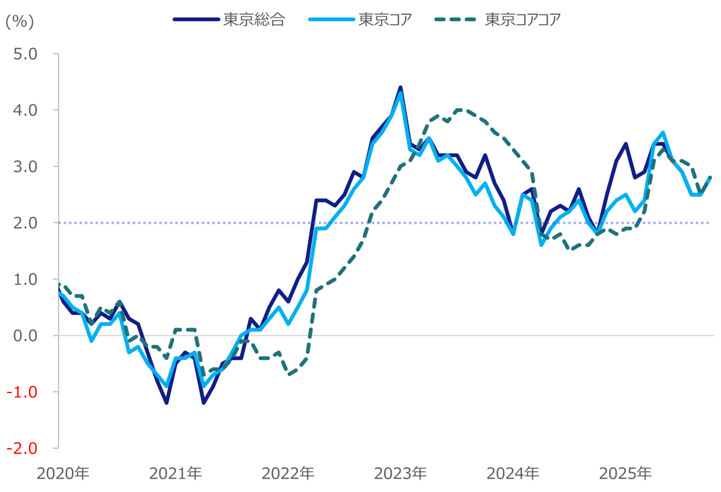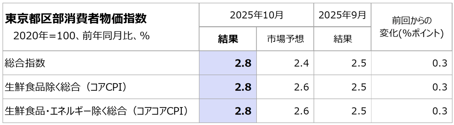 2025年10月の東京都区部消費者物価指数(以下、東京CPI)は、ヘッドラインの総合指数、コア指標である生鮮食品を除く総合指数、コアコアCPIと称される生鮮食品・エネルギー除く総合指数は、3指数そろって市場予想を上回る前年同月比2.8%上昇となりました(図表1)。