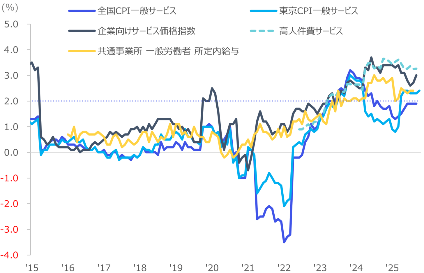 サービスの中でもより賃金動向の観点で注目される一般サービス(※)は同2.4%上昇(図表4、水色)と、0.1%ポイント伸びが上昇しました。それ以外のサービスや賃金関連の指標を見ても、企業向けサービス価格指数(図表4、黒)は底打ち感があり、再び前年同月比3%台での推移が確認されます。総じてみれば、サービスのインフレ基調は底堅いものと判断されるでしょう。