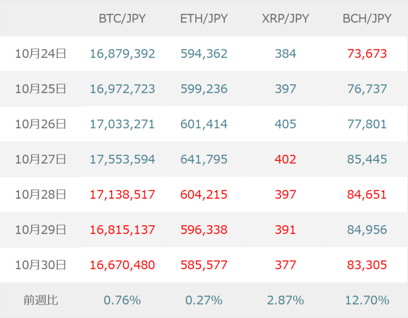 今週(10月24日~10月30日)の相場動向
