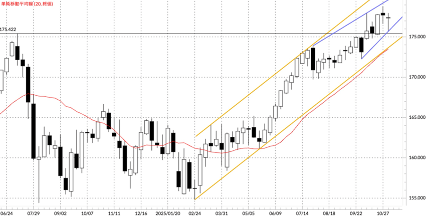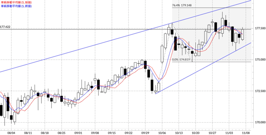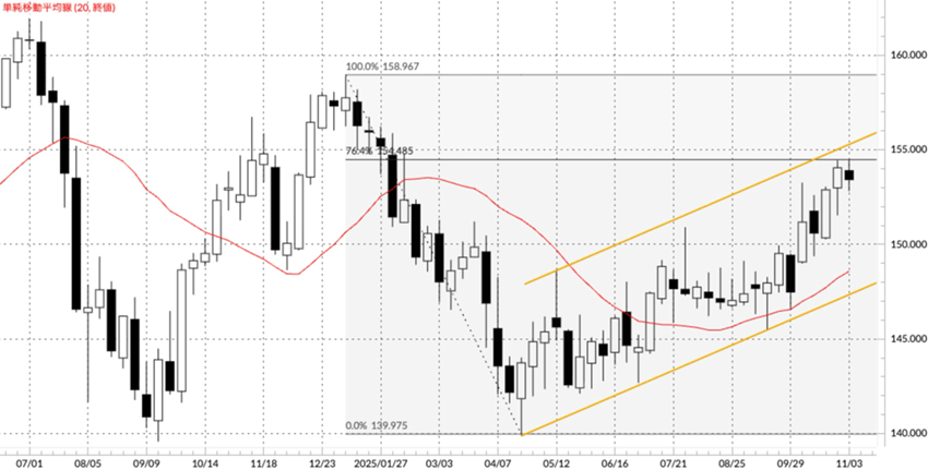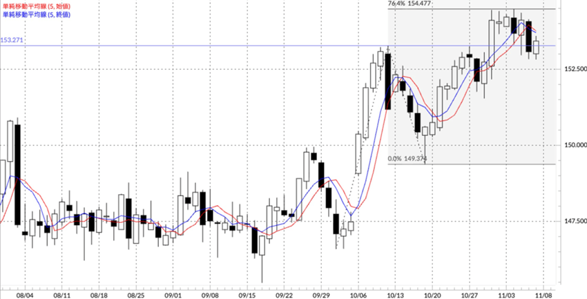 週足チャート(図表1)では、黄色いライン(長期)で示される平行上昇チャンネルの中での動きを続けています。現状はチャンネル上限に近づいている中で年初来高値と年初来安値の76.4%戻し154.485円でいったん達成感が出たように思えます。ただ、地合い的には米ドル/円は押し目買いが出やすい流れであることを考えると、今週(11月10日週)も基本的に調整の週になるという見方でよいと思います。