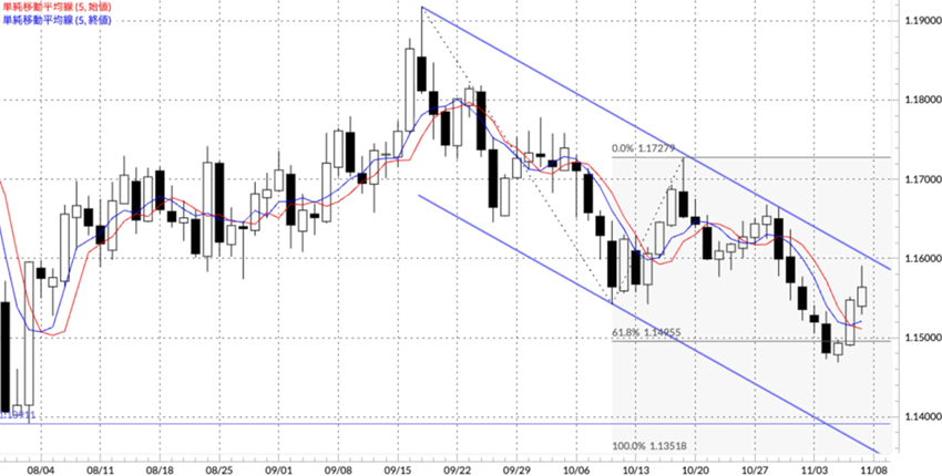 日足チャート(図表4)で見ると青の平行下降チャンネル内で上側のレジスタンスに近づいている状態です。しかし2本の移動平均線は10月30日のデッド・クロス状態から11月7日にゴールデン・クロスへと転じましたのでレジスタンスラインをトライするかどうかを見極めることとなります。上抜けできなければ長期トレンドの下げに戻ることになりますし、上抜けすれば短期的には直近高値1.16682ドル(10月28日)を試す可能性が出てきます。現状ではユーロ/円が底堅い動きとなっているため、ユーロ/米ドルとユーロ/円双方の動きを見ながら考える必要があります。