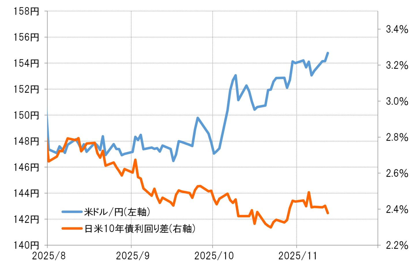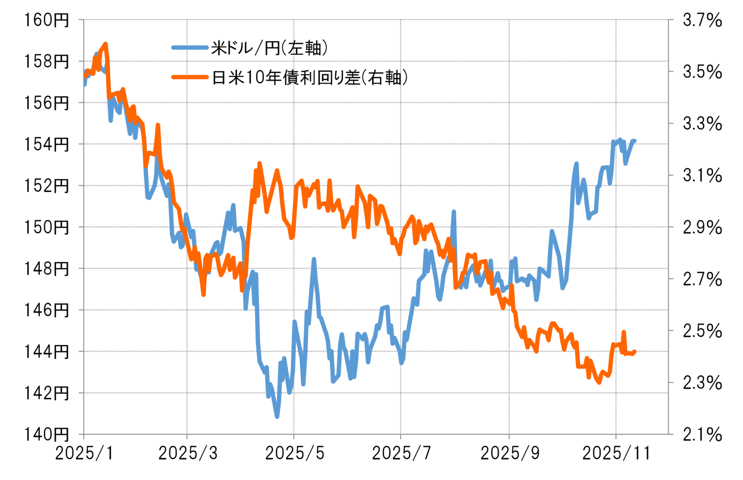 高市政権発足前後も、これまで金利差は縮小傾向が続いているが、それを尻目に米ドル高・円安が拡大している。金利差縮小は、本来的には円高要因と考えられるが、それとは逆に円安が広がっているわけだ。