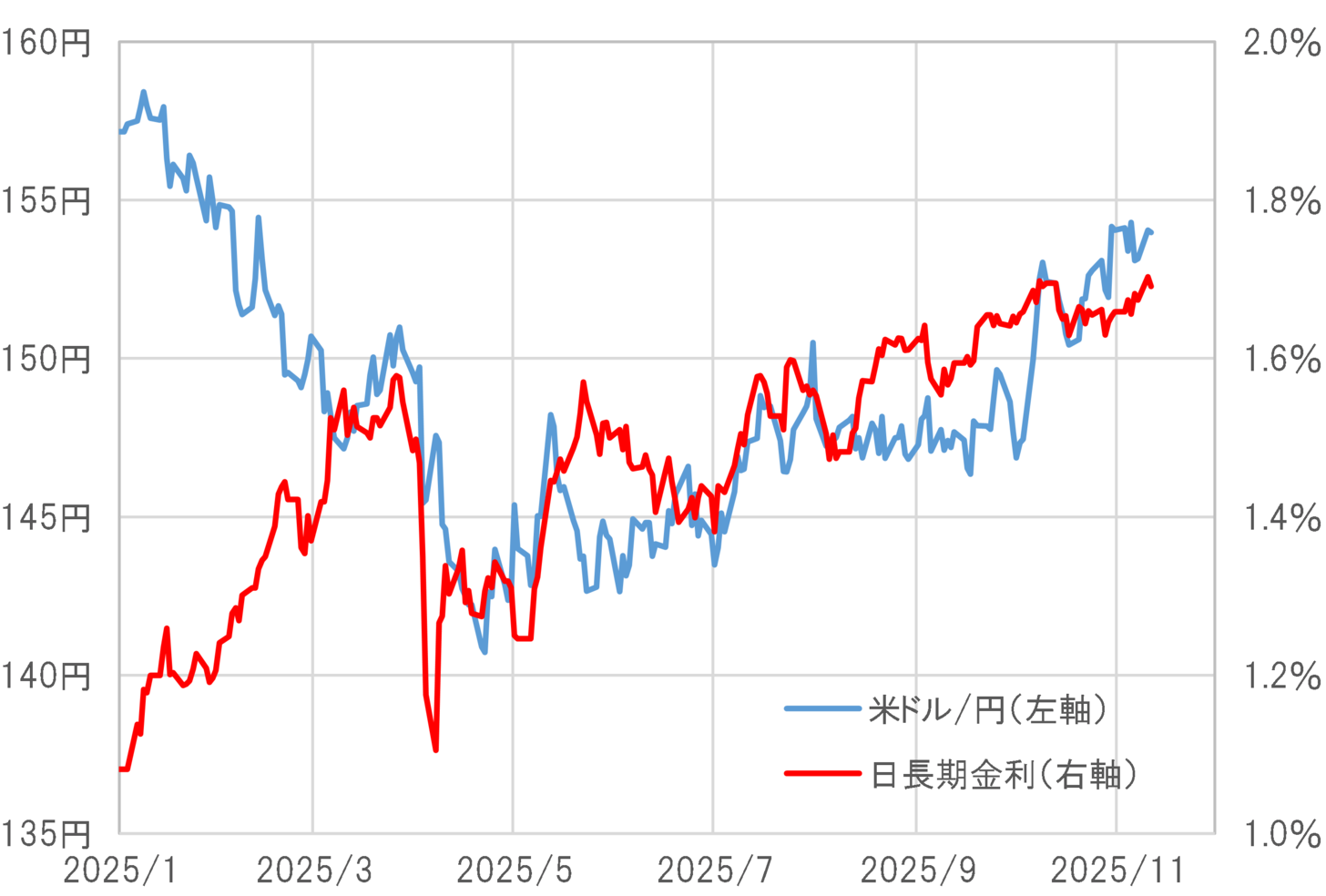 金利差と為替相場の関係において、方向が逆ながら、最近の米ドル/円と似たようなことが起こったのは2025年4月だった。米金利上昇を受けた日米金利差拡大を尻目に米ドル/円は急落に向かった(図表3参照)。米金利及び日米金利差と米ドルの逆方向の動きは、「金利上昇が通貨高ではなくむしろ通貨安をもたらす」という意味で、「悪い金利上昇」と呼ばれた。