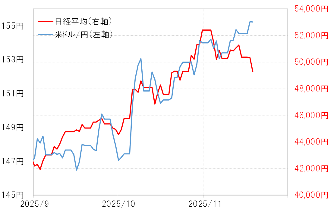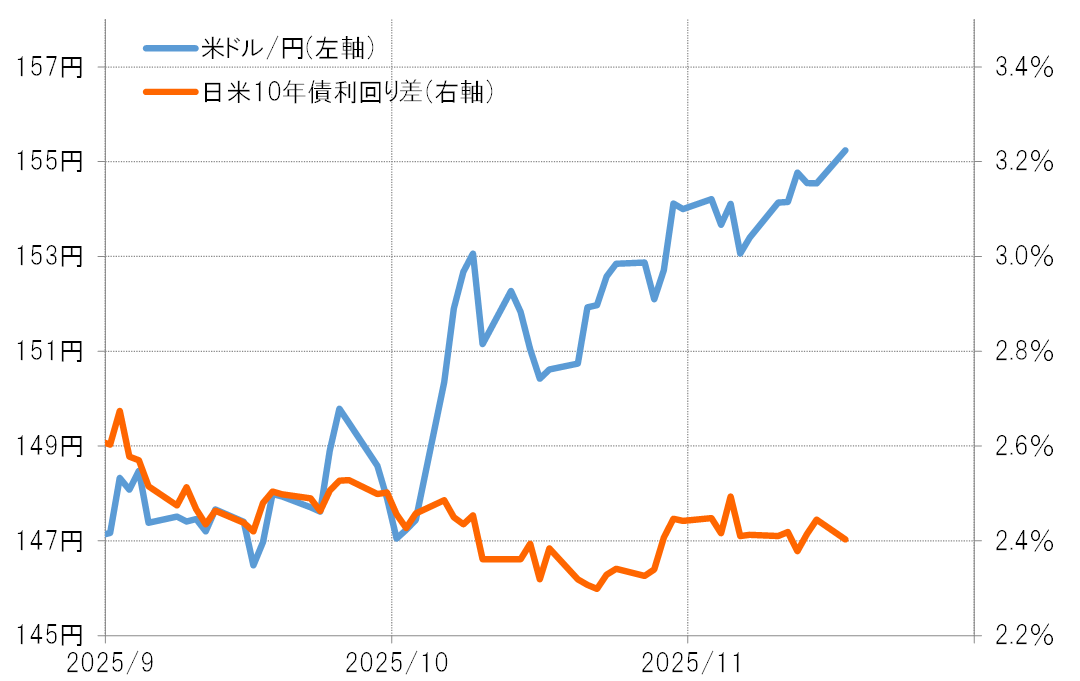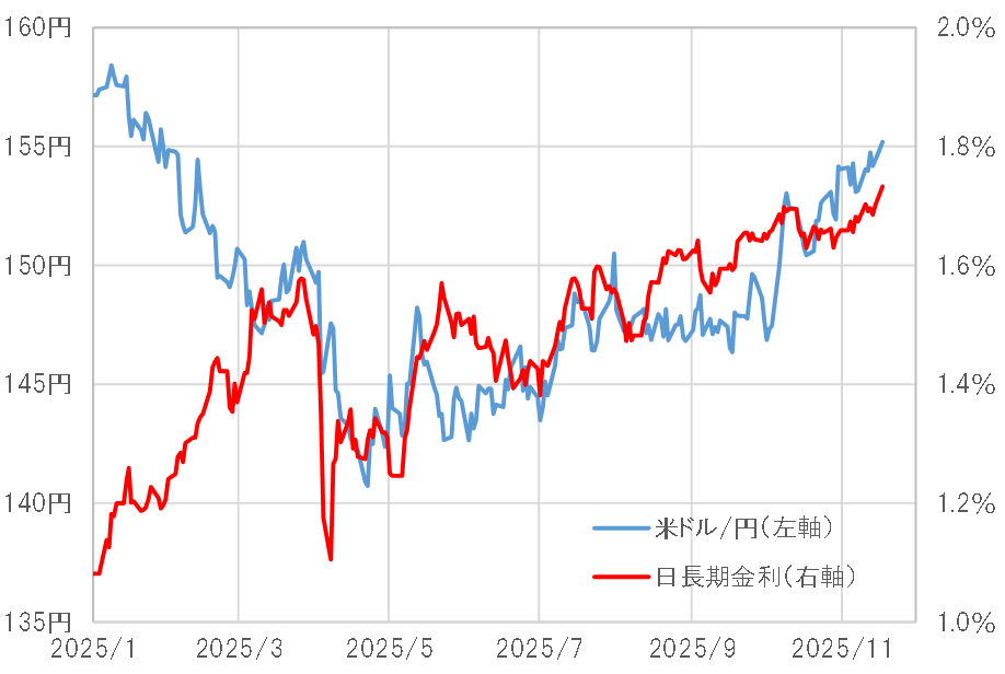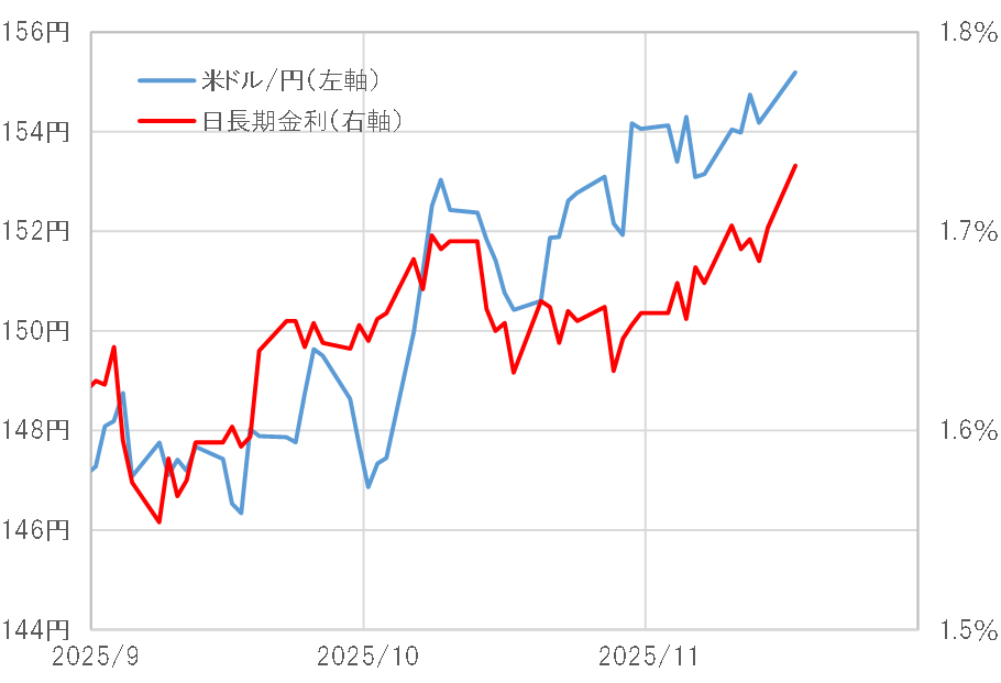 金利差でも株高でも説明できなくなった「高市円安」をある程度説明できそうなのは、いよいよ日本の長期金利上昇、債券価格下落だけになってきた可能性がある。10月後半に一旦、低下傾向となっていた日本の長期金利だったが、11月に入り上昇が再燃する中で、円安も再拡大する構図となっている(図表3参照)。