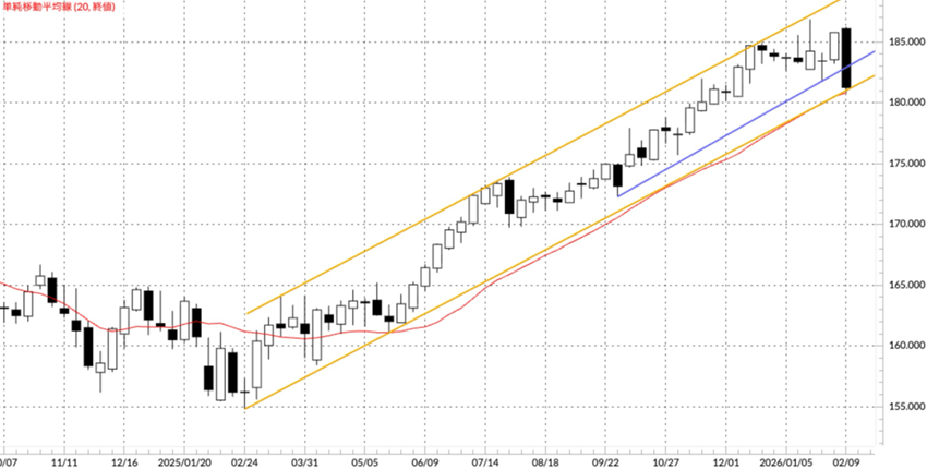 ユーロ/円(図表5)は、先週(2月9日週)の米ドル/円の円高の動きとともに大陰線が出現しました。そして、2025年9月29日からのサポートライン(青)を下抜け、2025年2月からのサポートライン(黄色)を試す流れになってきました。仮に今週もう一段の下げがあればサポートライン下抜けとなり、1年続いたユーロ/円上昇の流れに終止符を打つ可能性もあります。この長期サポートラインと20週移動平均線がほぼ重なって動いていることから、下抜け時は移動平均線も下抜ける動きが同時に発生しますので、今週(2月16日週)と来週(2月23日週)の動きは非常に重要になってきます。